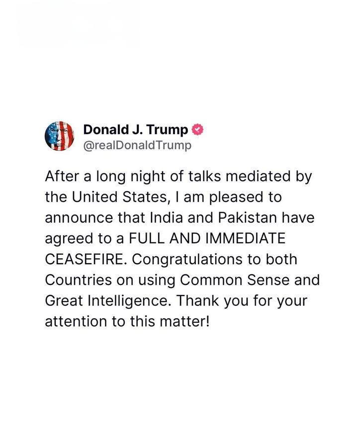 “After a long night of talks mediated by the United States, I am pleased to announce that India and Pakistan have agreed to a full and immediate ceasefire,” U.S. President Donald Trump announced in a post on Truth Social on Saturday. The two sides later confirmed that a ceasefire deal had been reached.