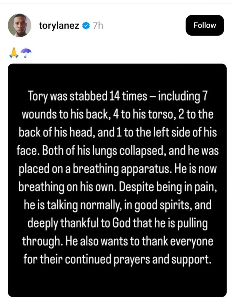 The star’s social media post said he was stabbed in the back, torso, head and face. He was temporarily placed on a breathing apparatus but is now able to breathe on his own, the Instagram post adds.