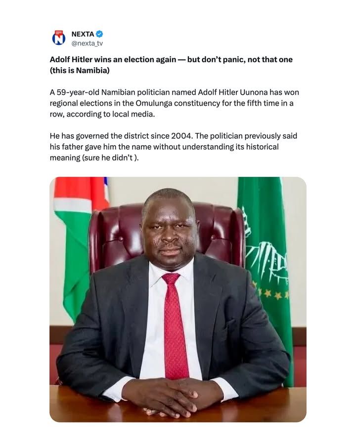 Shortly before the 2025 election, he told the paper that he wants to be referred to as ‘Adolf Uunona’ in the future, concerned that being referred to as Adolf Hitler was creating an image problem, despite having comfortably won previous elections.